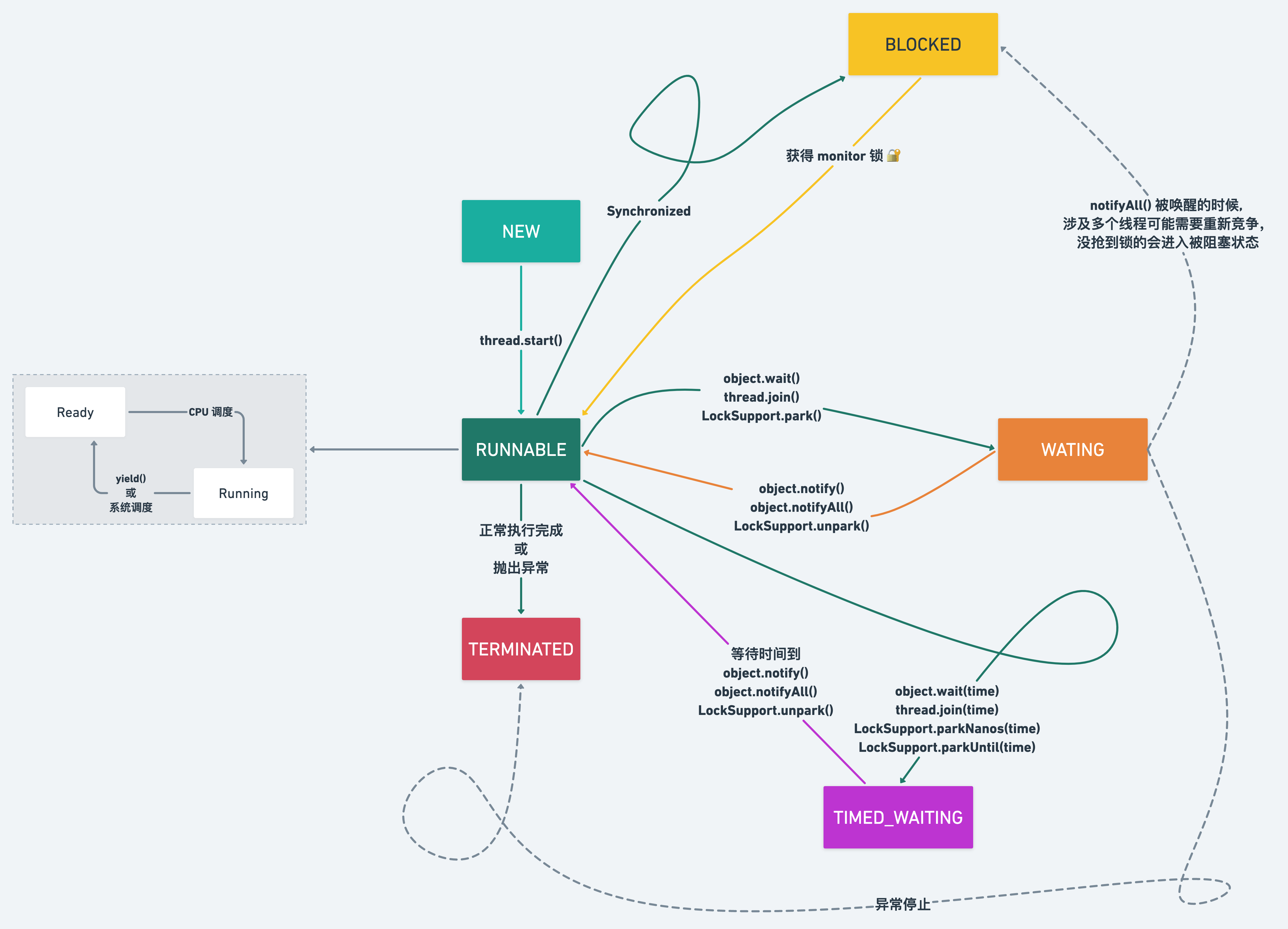 多线程中的 run 方法不能抛出异常,如果运行时发生异常,线程会停止运行,状态变成 Terminated。