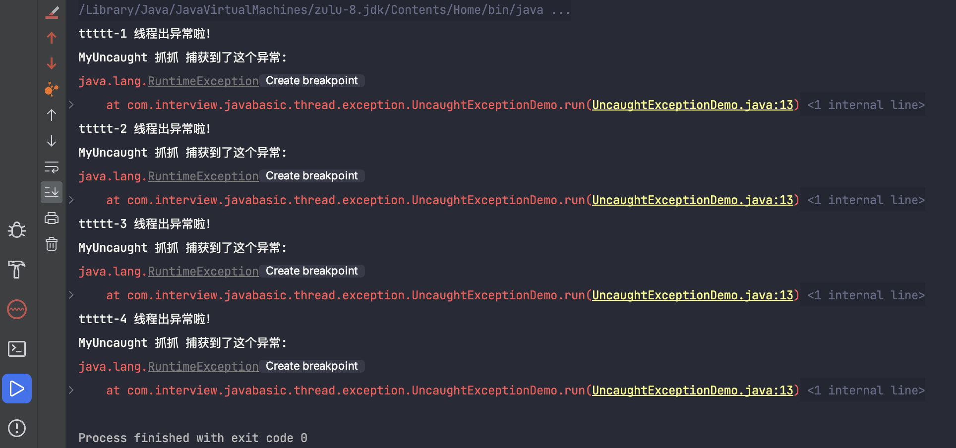 Thread.setDefaultUncaughtExceptionHandler(new MyUncaughtExceptionHandler("MyUncaught 抓抓"));